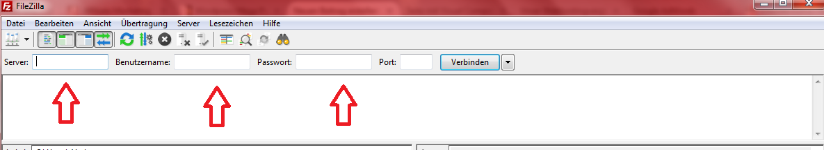 Nun benötigst Du die FTP-Daten von deinem Webhost. Diese bestehen aus der Serveradresse, dem FTP-Benutzernamen und dem FTP-Passwort. Sobald Du diese herausgesucht hast, trägst Du sie in folgenden Zeilen von Filezilla ein: